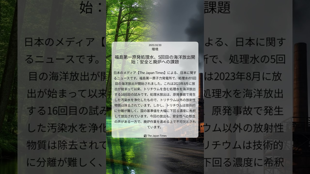 #福島第一原発 #処理水放出 #トリチウム #海洋放出 #原子力発電所 #TheJapanTimes #環境 #20251030 #Shorts