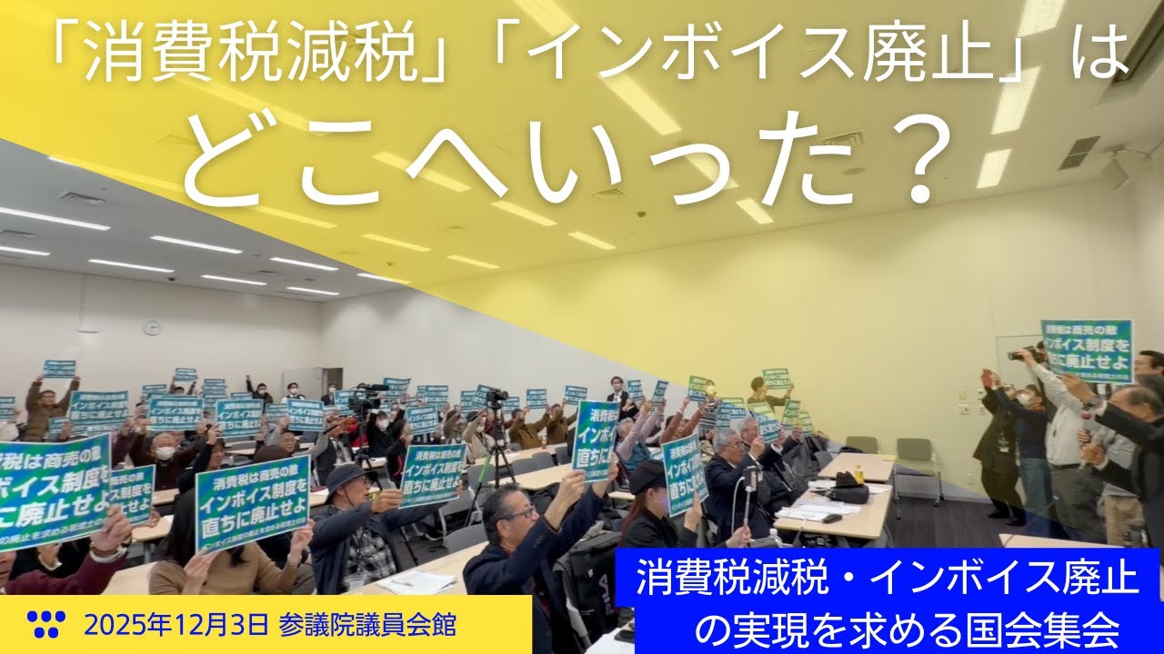 消費税減税・インボイス廃止の実現を求める国会集会の全編映像(主に終盤の基調報告で説明資料の投影あり)。