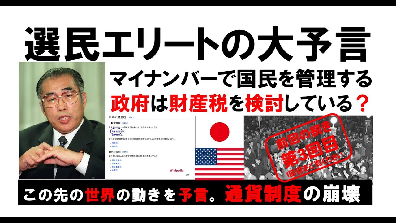 第3弾。選民エリートの大予言。マイナンバーで国民を管理する。政府は財産税を検討している?この先の世界の動きを予言。通貨制度の崩壊