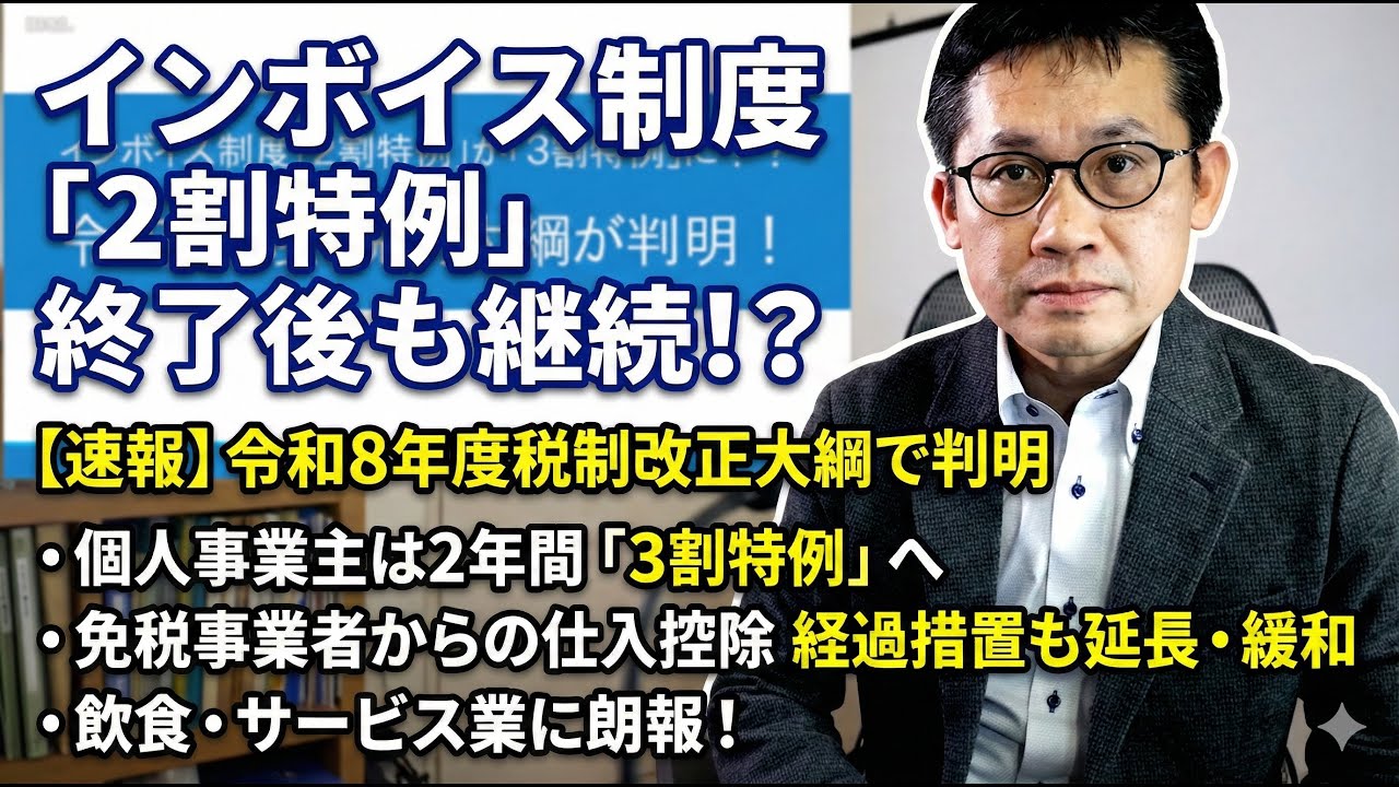 インボイス制度の導入から間もなく3年。 「2割特例がもうすぐ終わる…」と不安を感じていた個人事業主の方に大きなニュースが入ってきました!令和8年度(2026年度)の税制改正大綱により、2割特例の終了後も急激な負担増を避けるための「3割特例(仮称)」の新設や、経過措置のさらなる延長・緩和が閣議決定されました。今回の動画では、中小企業診断士の遠藤が、財務省の公表資料をベースに「何が変わるのか」「自分にはメリットがあるのか」をどこよりも分かりやすく深掘り解説します。