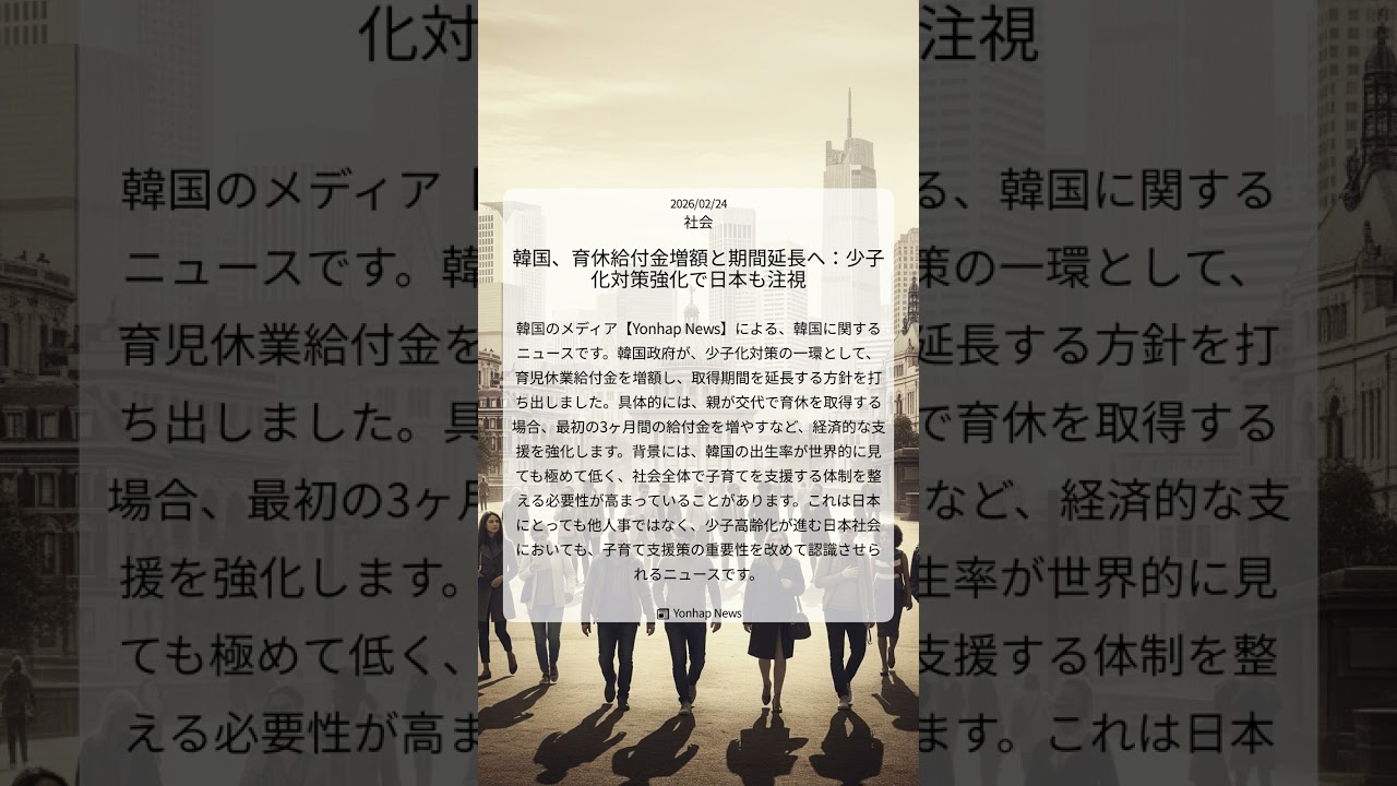#少子化対策 #育児休業 #給付金増額 #子育て支援 #韓国ニュース #YonhapNews #社会 #20260224 #Shorts