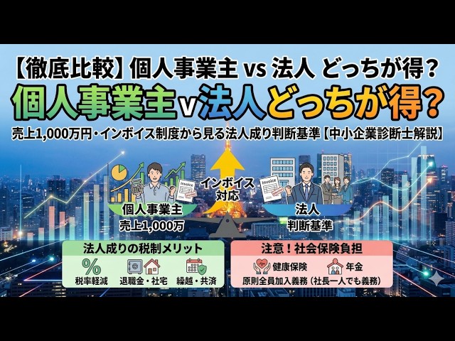 個人事業主が法人化を検討する際の判断基準について、中小企業診断士の視点から詳しく解説したものです。特に売上1,000万円という節目が、消費税の課税義務やインボイス制度への対応において重要な転換点になることを強調しています。法人成りのメリットとして節税効果や社会的信用の向上を挙げる一方で、社会保険料の負担増といった注意点についても公平に言及しています。単なる税金対策にとどまらず、将来の事業戦略や資金調達を見据えた総合的な経営判断の重要性を説く内容です。最終的には、確定申告後のタイミングで自身の事業形態を再考するための、実践的な指針を提示しています。