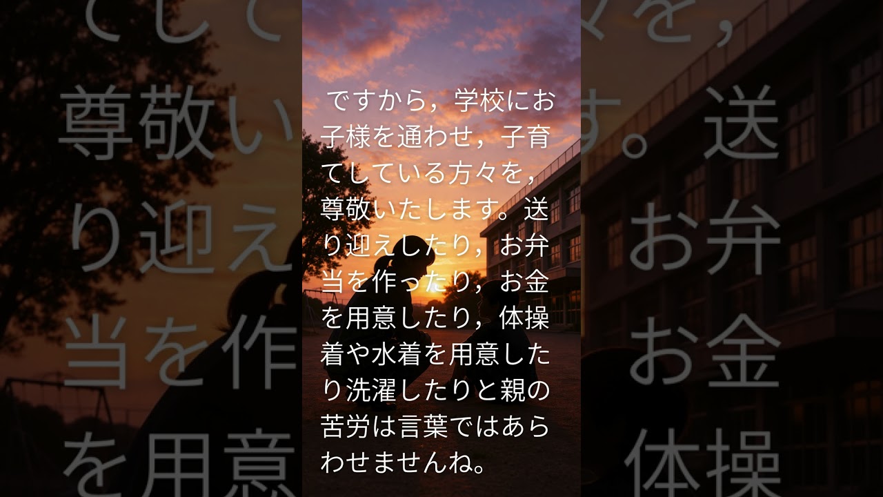 「少子化が進む今、子育て中の親御さんの努力は本当に尊いものです。送り迎え、お弁当、洗濯…毎日の小さな積み重ねが、子どもたちの成長につながっています。今日は割り算ができた、漢字を覚えた…そんな瞬間も大きな喜び。学校に来ているだけでもすごいこと、今日もたくさん褒めてあげましょう。」