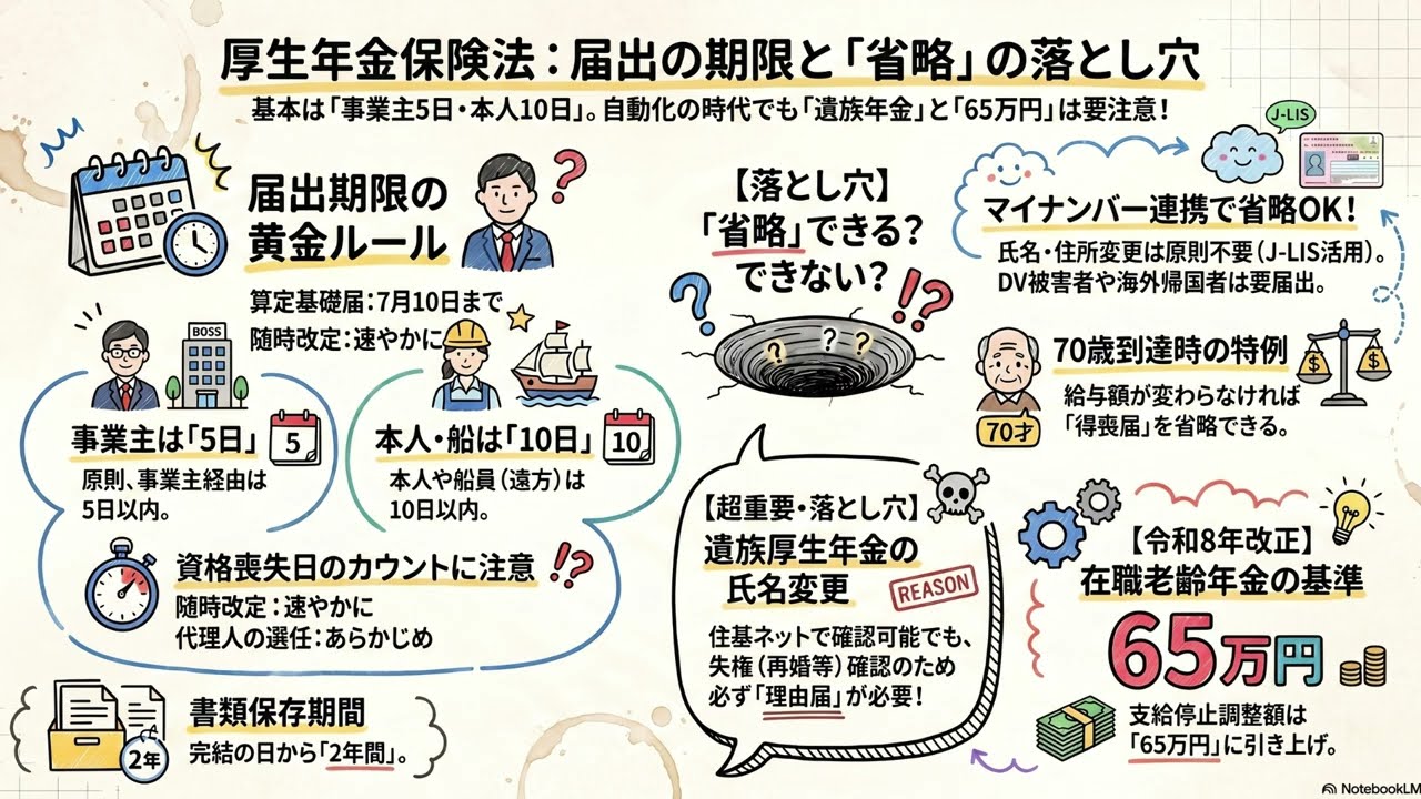 ご提示いただいたソースをもとに、令和8年(2026年)の社会保険労務士試験対策として、厚生年金保険法における「届出等」に関する重要ポイントを体系化して整理しました。