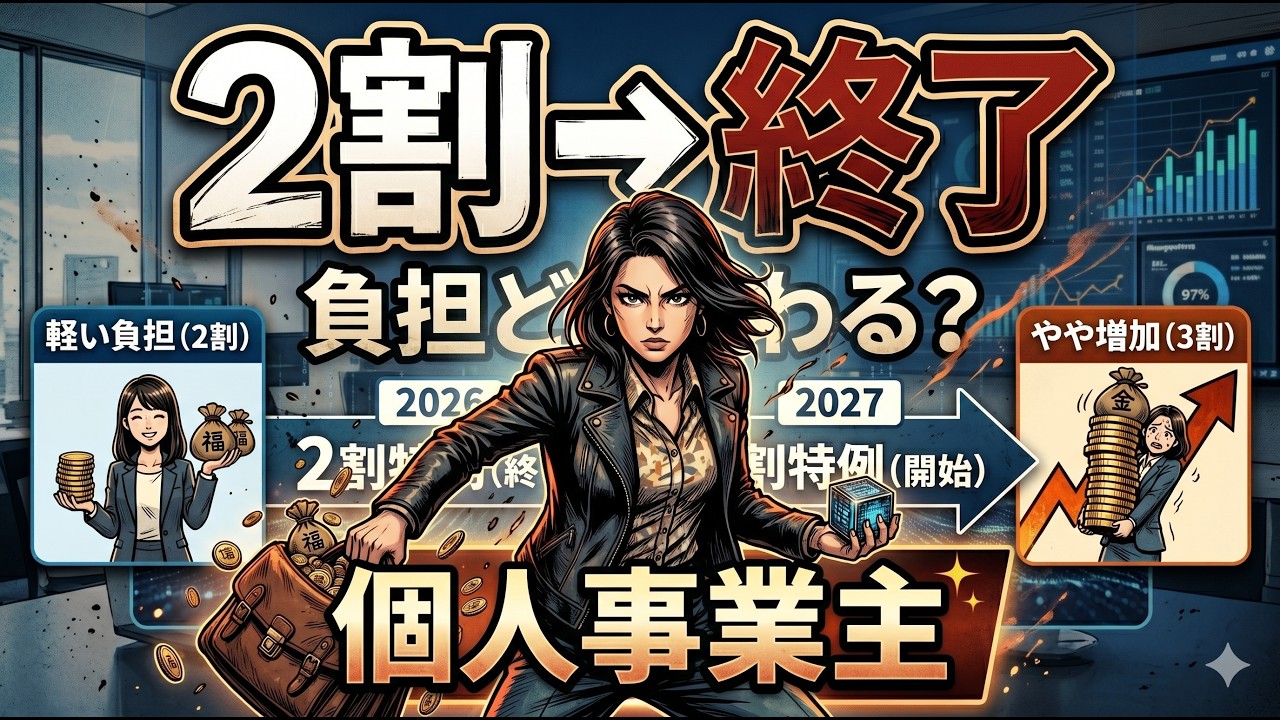 【情報の性質に関する注意書き】 本動画内で解説している制度の仕組みや移行時期(2026年での2割特例終了、2027年からの3割特例開始、買い手側の仕入税額控除の割合引き下げなど)は現行の法規制等に基づく確定情報です。一方で、「免税事業者に対する単価引き下げ交渉やインボイス登録の打診が活発になる可能性が高い」といった今後の市場動向や取引先との関係についての言及は、現状に基づく予測・仮説を含んでおります。参考としてお考えください。