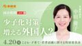14:28 中田議員質疑:政府の少子化対策により、日本人の子供が減り、仮に外国人の子供が増え続けた場合、社会に混乱を招きかねない。外国人の比率をどのようにしていくか、国家のビジョンを描いていただいた上で、少子化対策と外国人の受け入れ、人口動態を把握した上で政策策定を行っていただきたい。