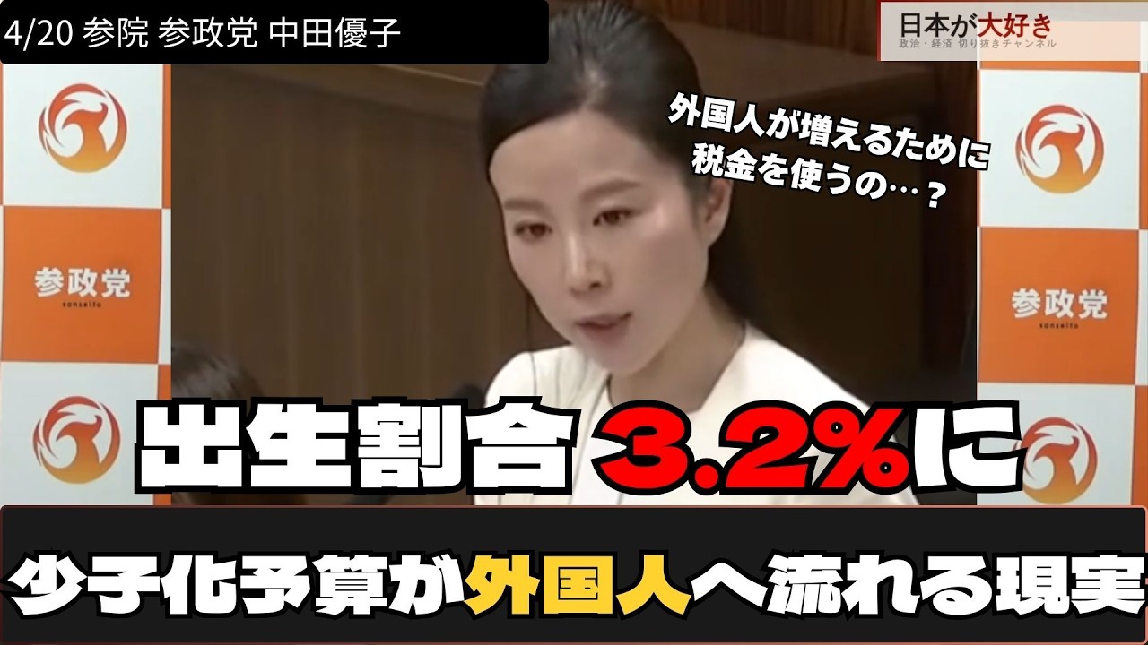 #中田優子 #参政党 #少子化対策 #外国人問題 #児童手当 #国会中継 #人口動態 #日本が大好き