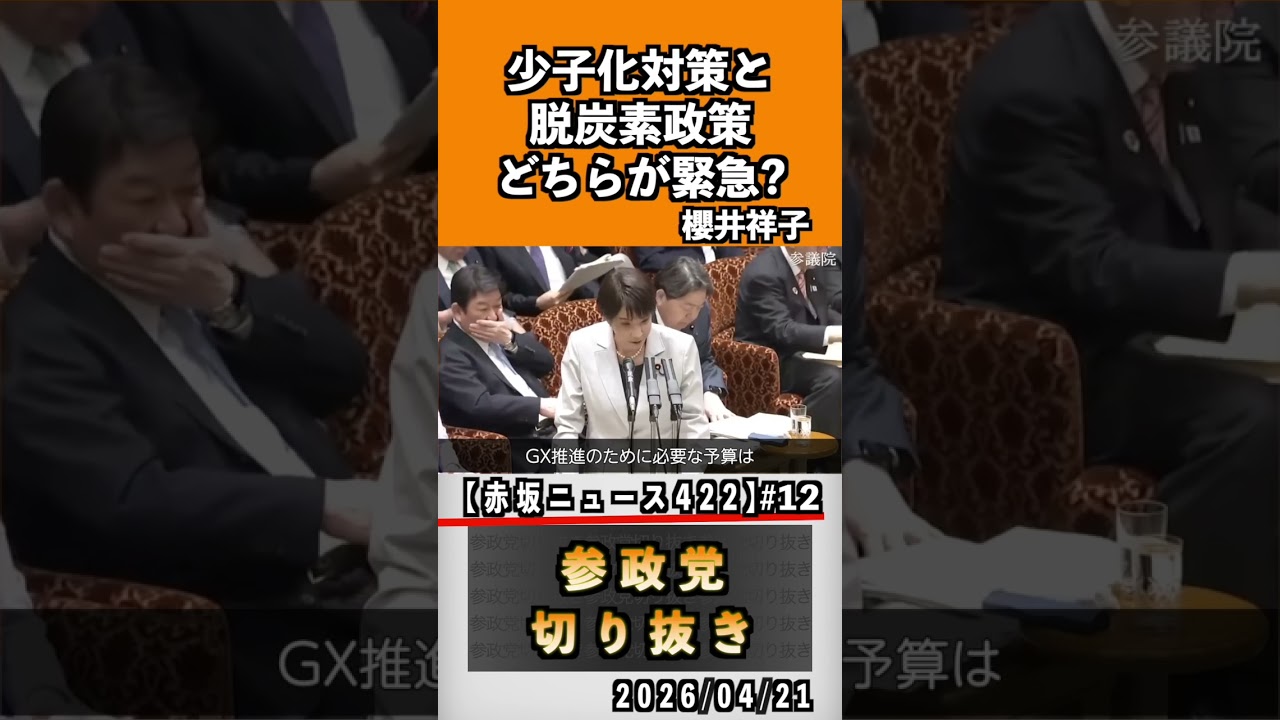 12 少子化対策と脱炭素政策どちらが緊急?#神谷宗幣 #参政党 #参政党は止まらない #ひとりひとりが日本#櫻井祥子 少子化対策 X Facebook はてブ Pocket LINE コピー 2026.04.28