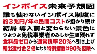インボイス制度 インボイス未来予想図 民間コスト約3兆円/年 強い免税事業者だけが生き残る 食料品ゼロ税率導入 通常税率が20% 輸出還付金2倍 特例措置90% #インボイス #消費税 #ザイム真理教 #財務省