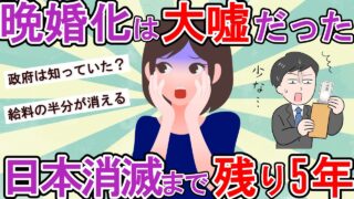 晩婚化は大嘘だった。20代で結婚できない絶望の現実。年収300万の壁で結婚離れが加速!2030年以降、日本から毎年100万人が消えていきます。データが示す残酷な未来。5年後、日本はこうなっている。少子化、就職氷河期世代、2025年問題につい...